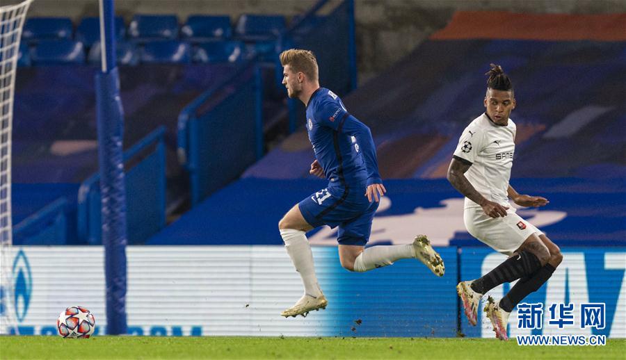 11月4日,切尔西队球员维尔纳(左)遭到雷恩队球员达尔伯特的犯规防守。 当日,在2020-2021赛季欧洲足球冠军联赛E组小组赛第三轮比赛中,英超切尔西队主场以3比0战胜法甲雷恩队。 新华社发(洛克莱夫摄)