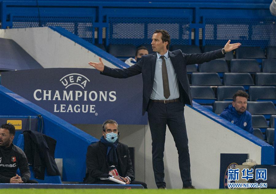 11月4日,雷恩队主帅斯特凡在场边。 当日,在2020-2021赛季欧洲足球冠军联赛E组小组赛第三轮比赛中,英超切尔西队主场以3比0战胜法甲雷恩队。 新华社发(洛克莱夫摄)
