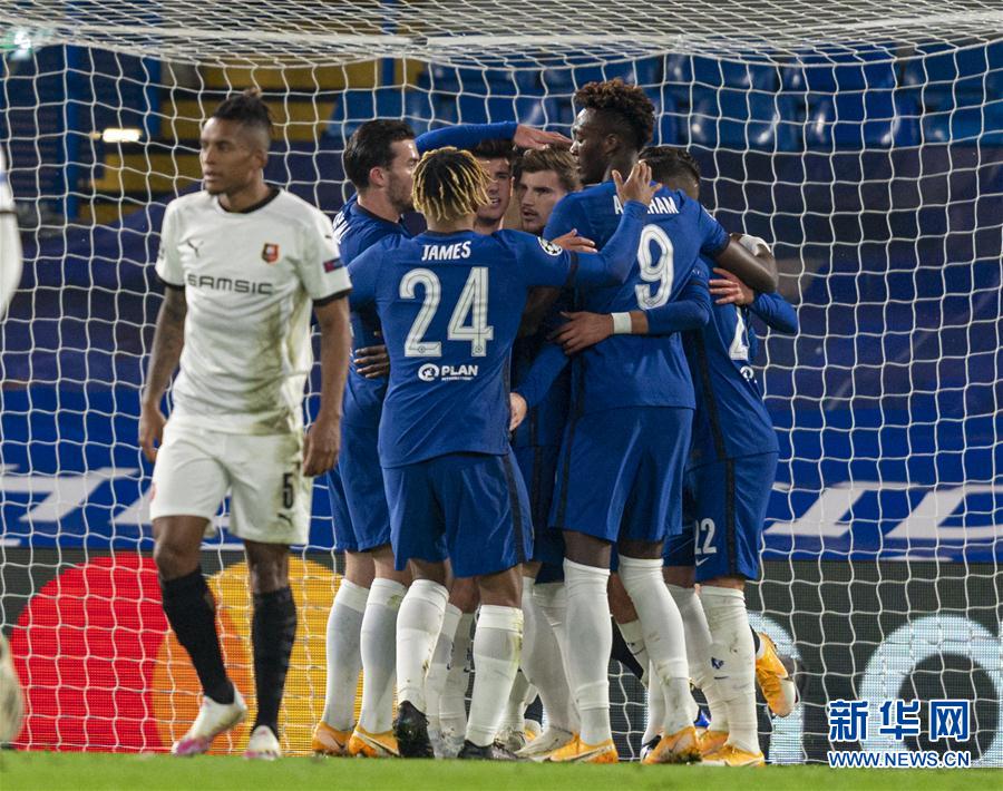11月4日,切尔西队球员庆祝维尔纳的进球。 当日,在2020-2021赛季欧洲足球冠军联赛E组小组赛第三轮比赛中,英超切尔西队主场以3比0战胜法甲雷恩队。 新华社发(洛克莱夫摄)