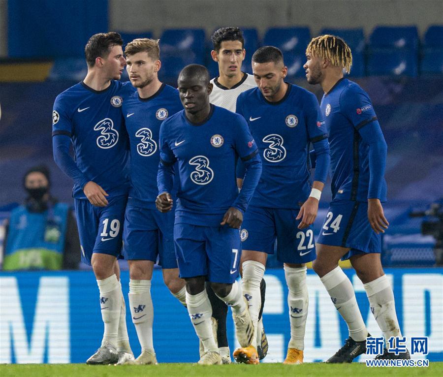 11月4日,切尔西队球员维尔纳(左二)在打入第二粒点球后与队友庆祝。 当日,在2020-2021赛季欧洲足球冠军联赛E组小组赛第三轮比赛中,英超切尔西队主场以3比0战胜法甲雷恩队。 新华社发(洛克莱夫摄)