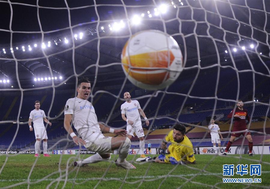 11月5日,罗马队球员马约拉尔(右一)射门得分。 当日,在2020-2021赛季欧罗巴联赛A组小组赛第三轮比赛中,意大利罗马队主场以5比0战胜罗马尼亚克卢日队。 新华社/路透