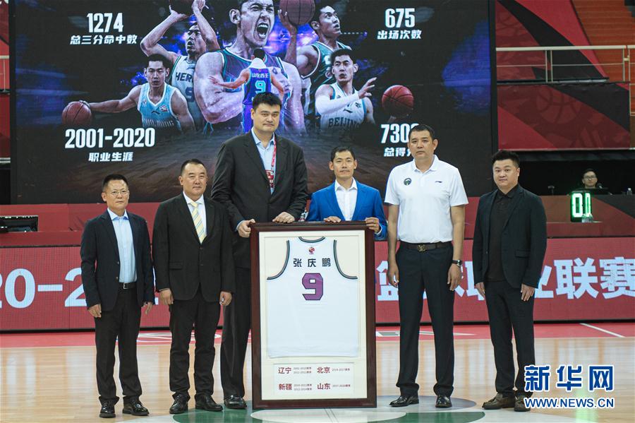 11月6日,参与张庆鹏退役仪式的嘉宾和张庆鹏(右三)一同与退役球衣合影留念。 当日,在浙江诸暨举行的2020-2021赛季中国男子篮球职业联赛(CBA)第一阶段第九轮山东西王队对阵辽宁本钢队的比赛前,CBA为老将张庆鹏举办了退役仪式。2001-2002赛季,张庆鹏在辽宁队开启了职业生涯,联赛共出场675次,总得分7303分,他于2020年9月宣布退役。 新华社发(江汉摄)