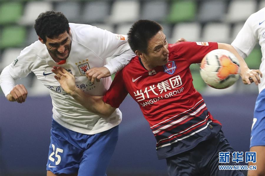 11月6日,重庆当代队球员徐武(右)与山东鲁能泰山队球员费莱尼在比赛中拼抢。 当日,在2020赛季中国足球协会超级联赛(苏州赛区)第19轮比赛中,重庆当代队以4比3战胜山东鲁能泰山队。 新华社记者 杨磊 摄