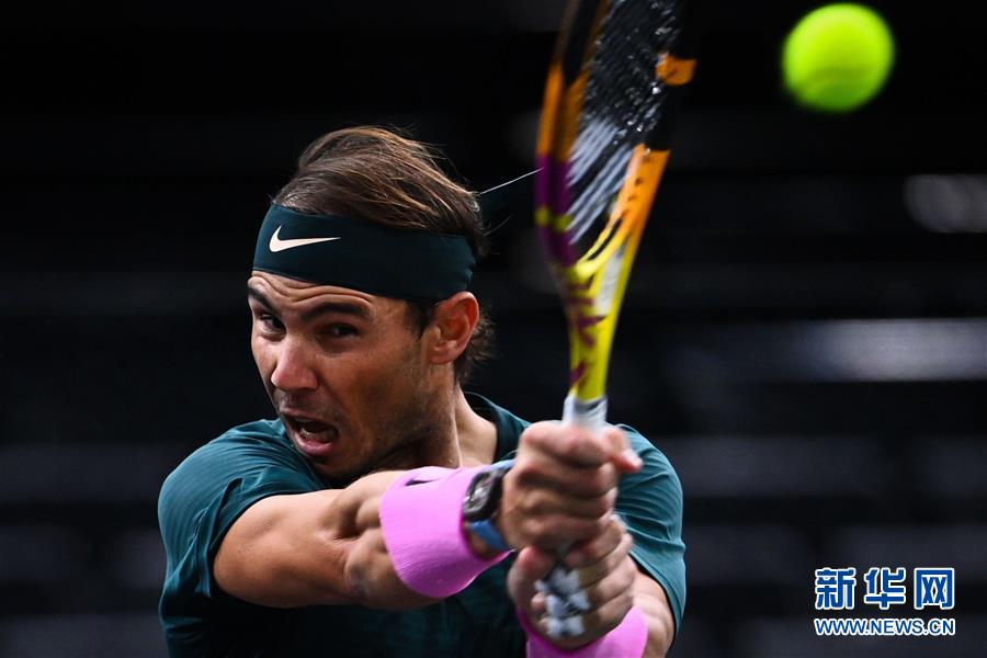 11月7日,纳达尔在比赛中回球。 当日,在巴黎网球大师赛男单半决赛中,西班牙选手纳达尔以0比2不敌德国选手兹维列夫,无缘决赛。 新华社/法新