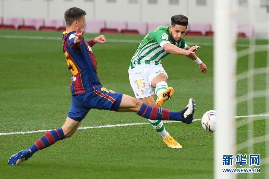 11月7日,巴塞罗那队球员朗格莱(左)和皇家贝蒂斯队球员莫雷诺拼抢。 当日,在2020-2021赛季西班牙足球甲级联赛第九轮比赛中,巴塞罗那队主场以5比2战胜皇家贝蒂斯队。 新华社/法新