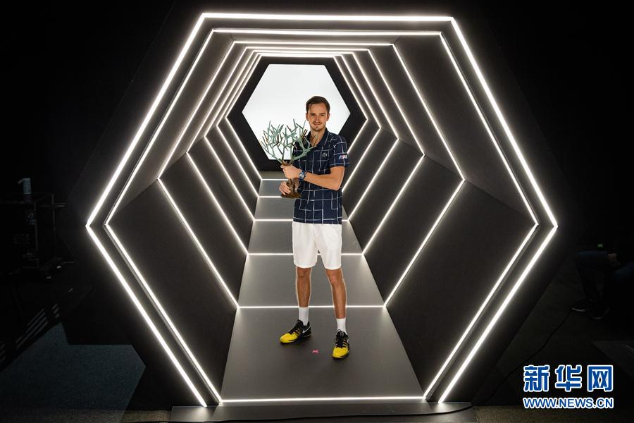 11月8日,梅德韦杰夫在颁奖仪式上。 当日,在2020巴黎网球大师赛单打决赛中,俄罗斯选手梅德韦杰夫以2比1战胜德国选手兹维列夫,获得冠军。 新华社发(奥雷利安·莫里萨尔摄)