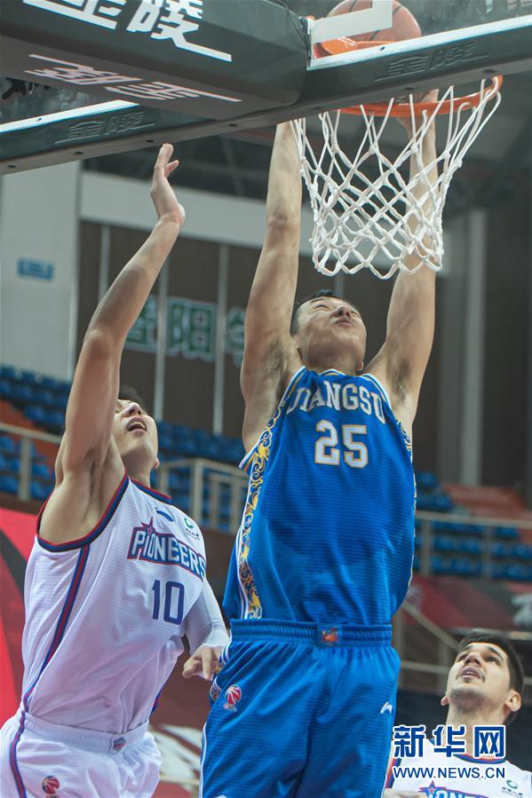 11月9日,苏州肯帝亚队球员郑祺龙(中)在比赛中扣篮。 当日,在浙江诸暨举行的2020-2021赛季中国男子篮球职业联赛(CBA)第一阶段第十轮比赛中,苏州肯帝亚队以108比105战胜天津先行者队。 新华社发(江汉摄)