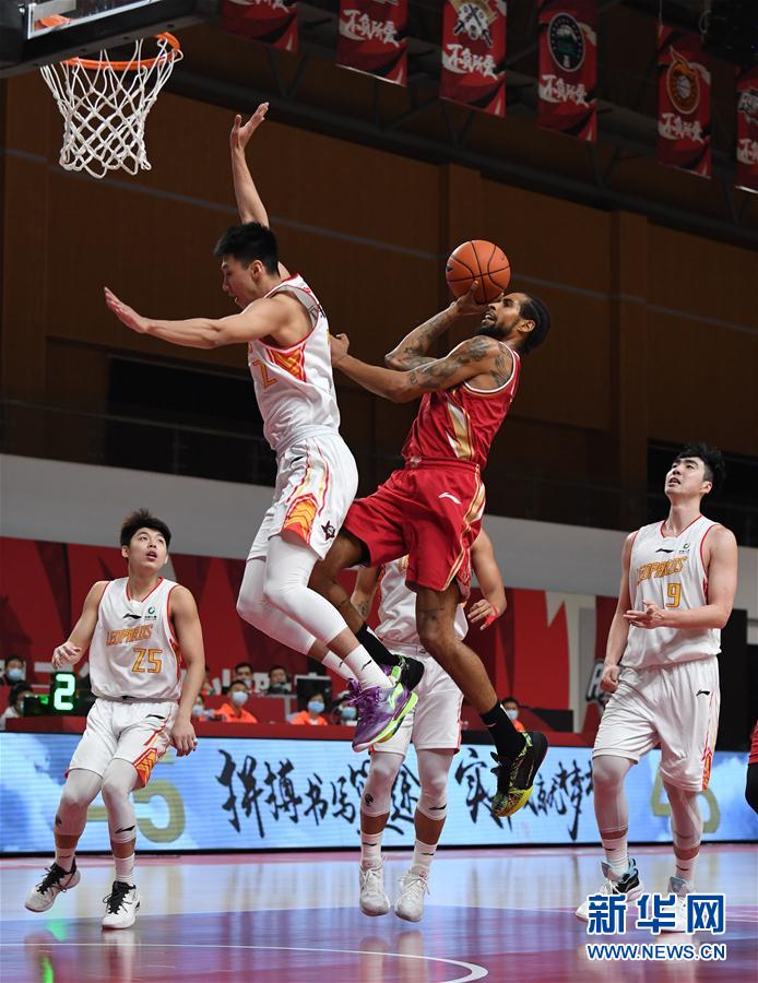 11月9日,浙江稠州金租队球员兰兹博格(上右)在比赛中上篮。 当日,在浙江诸暨举行的2020-2021赛季中国男子篮球职业联赛(CBA)第一阶段第十轮比赛中,浙江稠州金租队以106比104战胜深圳马可波罗队。 新华社记者 沙达提 摄