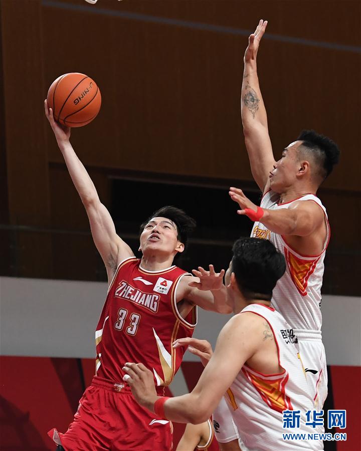 11月9日,浙江稠州金租队球员吴前(左)在比赛中上篮。 当日,在浙江诸暨举行的2020-2021赛季中国男子篮球职业联赛(CBA)第一阶段第十轮比赛中,浙江稠州金租队以106比104战胜深圳马可波罗队。 新华社记者 沙达提 摄