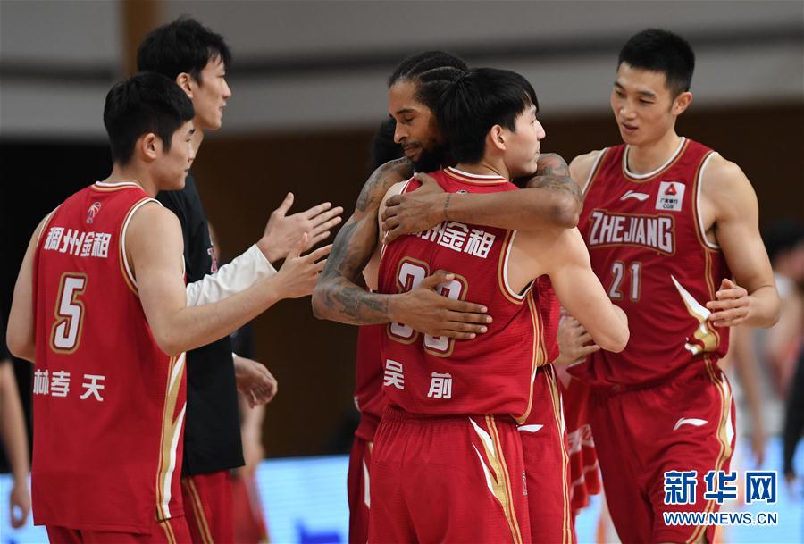11月9日,浙江稠州金租队球员吴前(中前)与队友兰兹博格(中后)在比赛后庆祝胜利。 当日,在浙江诸暨举行的2020-2021赛季中国男子篮球职业联赛(CBA)第一阶段第十轮比赛中,浙江稠州金租队以106比104战胜深圳马可波罗队。 新华社记者 沙达提 摄
