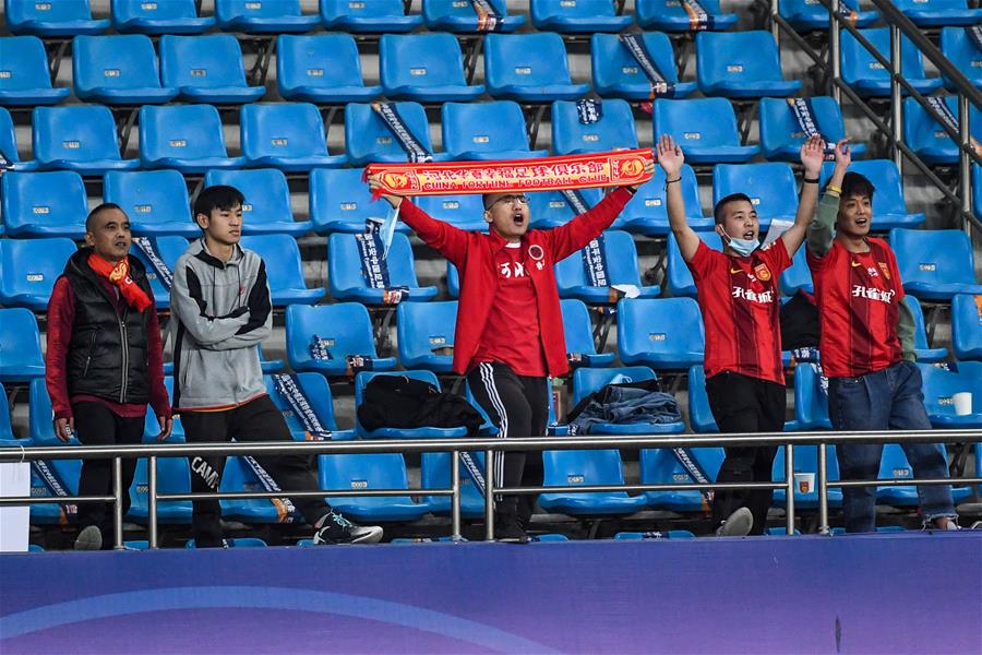 11月10日,现场观战的河北华夏幸福队球迷为球队助威。 当日,在2020赛季中国足球协会超级联赛(苏州赛区)第七、八名排位赛次回合比赛中,河北华夏幸福队以0比1不敌上海绿地申花队。最终,河北华夏幸福队以总比分1比5不敌上海绿地申花队,获得本赛季中超第八名。 新华社记者 李博 摄