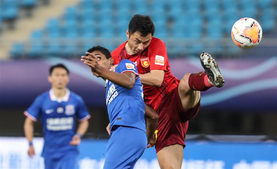 11月10日,上海绿地申花队球员马丁内斯(前左)与河北华夏幸福队球员潘喜明(前右)在比赛中拼抢。 当日,在2020赛季中国足球协会超级联赛(苏州赛区)第七、八名排位赛次回合比赛中,河北华夏幸福队以0比1不敌上海绿地申花队。最终,河北华夏幸福队以总比分1比5不敌上海绿地申花队,获得本赛季中超第八名。 新华社记者 杨磊 摄