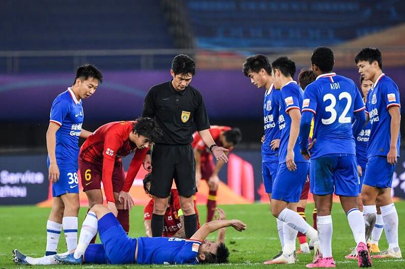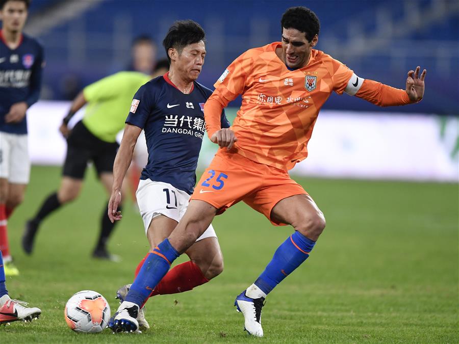 11月10日,山东鲁能泰山队球员费莱尼(右)与重庆当代队球员吴庆拼抢。 当日,在2020赛季中国足球协会超级联赛(苏州赛区)争冠组第五、六名排位赛次回合比赛中,山东鲁能泰山队和重庆当代队在常规时间和加时赛中打成2比1,总分5比5战平;在点球大战中,山东鲁能泰山队以4比3战胜重庆当代队,从而以两回合总比分比9比8战胜重庆当代队,获得联赛第五名。 新华社记者 许畅 摄