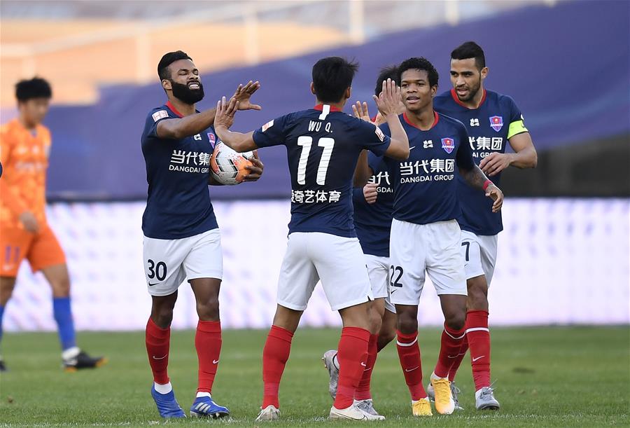 11月10日,重庆当代队球员费尔南迪尼奥(左一)在比赛中庆祝进球。 当日,在2020赛季中国足球协会超级联赛(苏州赛区)争冠组第五、六名排位赛次回合比赛中,重庆当代队与山东鲁能泰山队在常规时间和加时赛中打成1比2,总分5比5战平;在点球大战中,重庆当代队以3比4不敌山东鲁能泰山队,从而以两回合总比分8比9不敌山东鲁能泰山队,获得本赛季联赛第六名。 新华社记者 许畅 摄