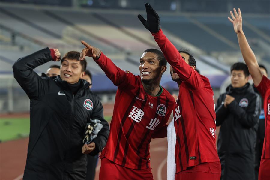 11月10日,河南建业队球员卡兰加(中)、多拉多(右)在比赛后向球迷致谢。 当日,在2020赛季中国足球协会超级联赛(大连赛区)第九、十名排位赛次回合比赛中,河南建业队以2比1战胜天津泰达队。最终,河南建业队以两回合总比分2比1战胜天津泰达队,获得本赛季联赛第九名。 新华社记者 潘昱龙 摄