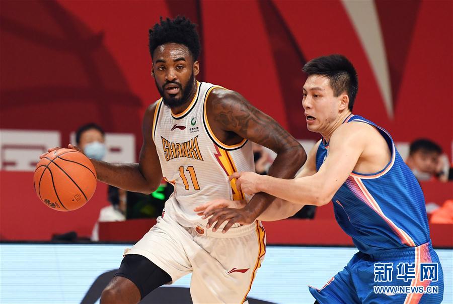 11月10日,山西汾酒股份队球员富兰克林(左)在比赛中带球突破。 当日,在浙江诸暨举行的2020-2021赛季中国男子篮球职业联赛(CBA)第一阶段第11轮比赛中,四川五粮金樽队以108比103战胜山西汾酒股份队。 新华社记者 沙达提 摄