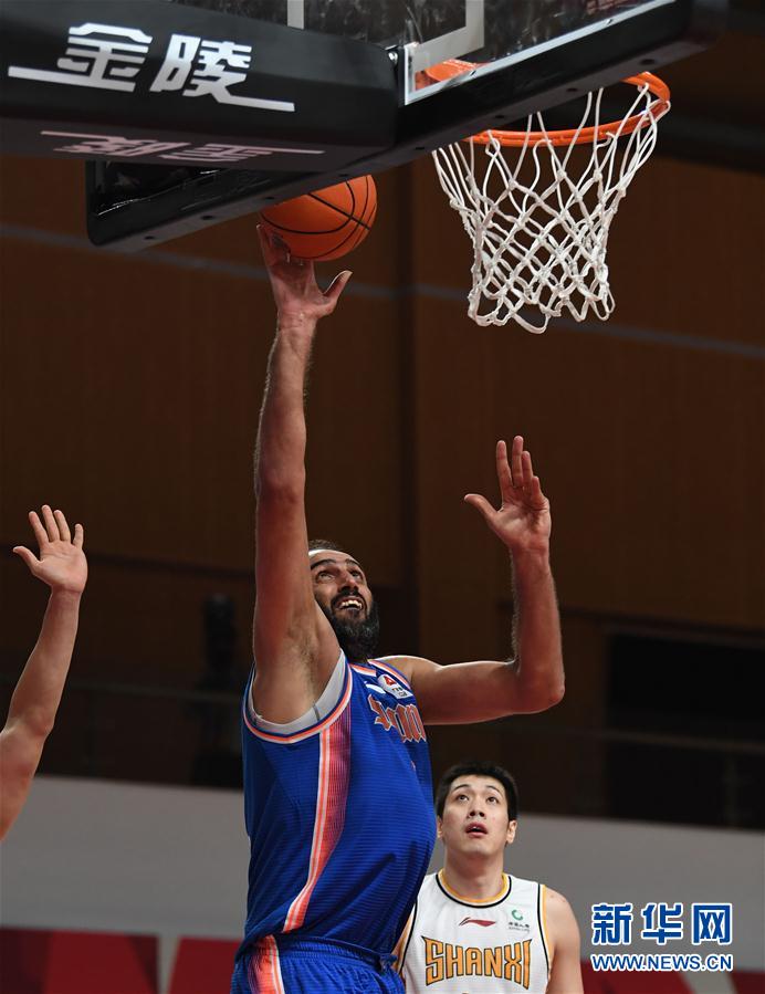 11月10日,四川五粮金樽队球员哈达迪(左)在比赛中上篮。 当日,在浙江诸暨举行的2020-2021赛季中国男子篮球职业联赛(CBA)第一阶段第11轮比赛中,四川五粮金樽队以108比103战胜山西汾酒股份队。 新华社记者 沙达提 摄