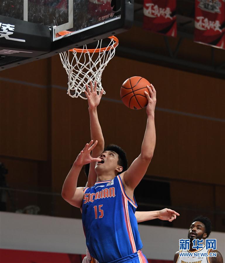 11月10日,四川五粮金樽队球员苏若禹(前)在比赛中突破上篮。 当日,在浙江诸暨举行的2020-2021赛季中国男子篮球职业联赛(CBA)第一阶段第11轮比赛中,四川五粮金樽队以108比103战胜山西汾酒股份队。 新华社记者 沙达提 摄