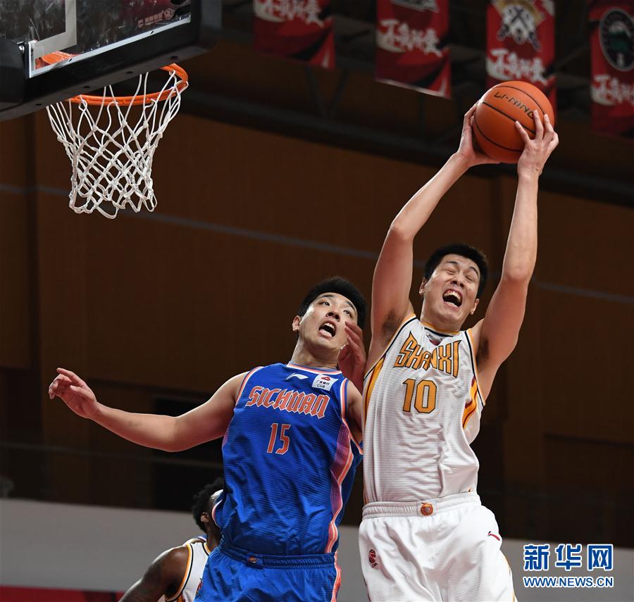 11月10日,山西汾酒股份队球员任骏威(右)与四川五粮金樽队球员李原宇在比赛中拼抢篮板。 当日,在浙江诸暨举行的2020-2021赛季中国男子篮球职业联赛(CBA)第一阶段第11轮比赛中,四川五粮金樽队以108比103战胜山西汾酒股份队。 新华社记者 沙达提 摄