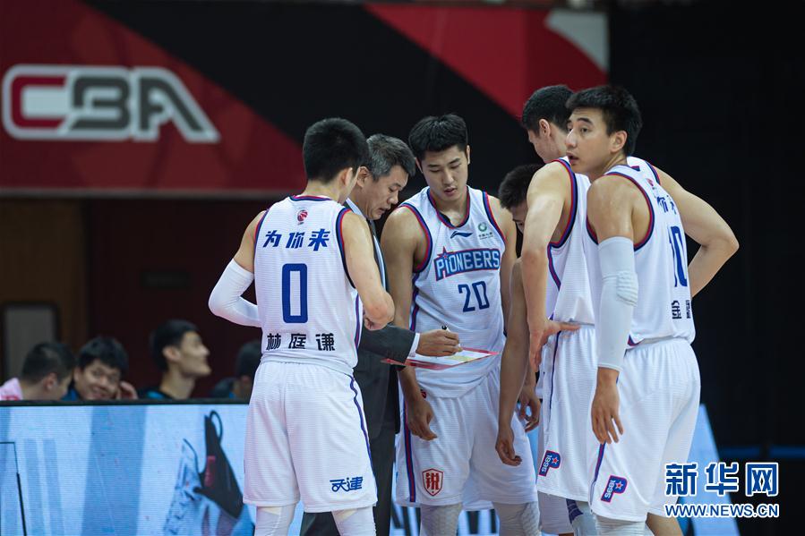 11月11日,天津先行者队主教练刘铁(前左二)在比赛暂停期间布置战术。 当日,在浙江诸暨举行的2020-2021赛季中国男子篮球职业联赛(CBA)第一阶段第11轮比赛中,山东西王队以120比102战胜天津先行者队。 新华社发(江汉摄)