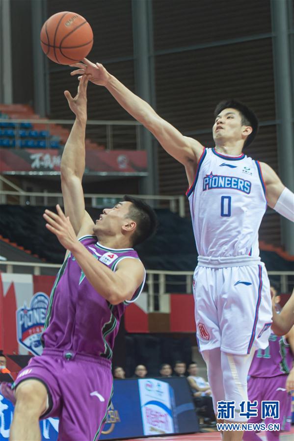 11月11日,天津先行者队球员林庭谦(上)在比赛中封盖山东西王队球员刘毅的投篮。 当日,在浙江诸暨举行的2020-2021赛季中国男子篮球职业联赛(CBA)第一阶段第11轮比赛中,山东西王队以120比102战胜天津先行者队。 新华社发(江汉摄)