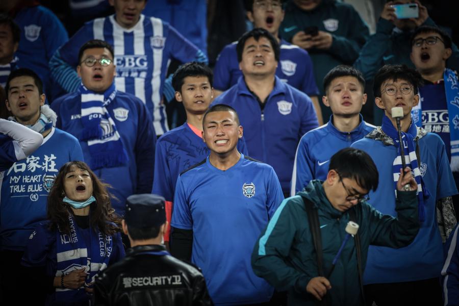 11月11日,现场观战的石家庄永昌队球迷在球队降级后落泪。