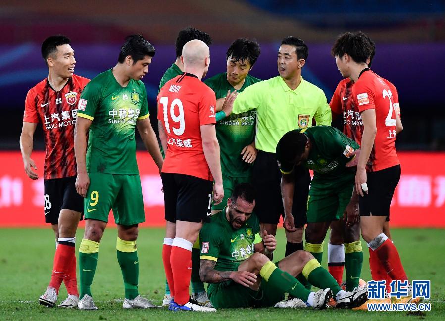 11月11日,主裁判郭宝龙(右四)在比赛中执裁。当日,在2020赛季中国足球协会超级联赛(苏州赛区)争冠组第三、四名排位赛次回合比赛中,北京中赫国安队以1比1战平上海上港队,从而以两回合总比分3比2战胜上海上港队,获得本赛季联赛季军,上海上港队获得第四名。新华社记者 许畅 摄
