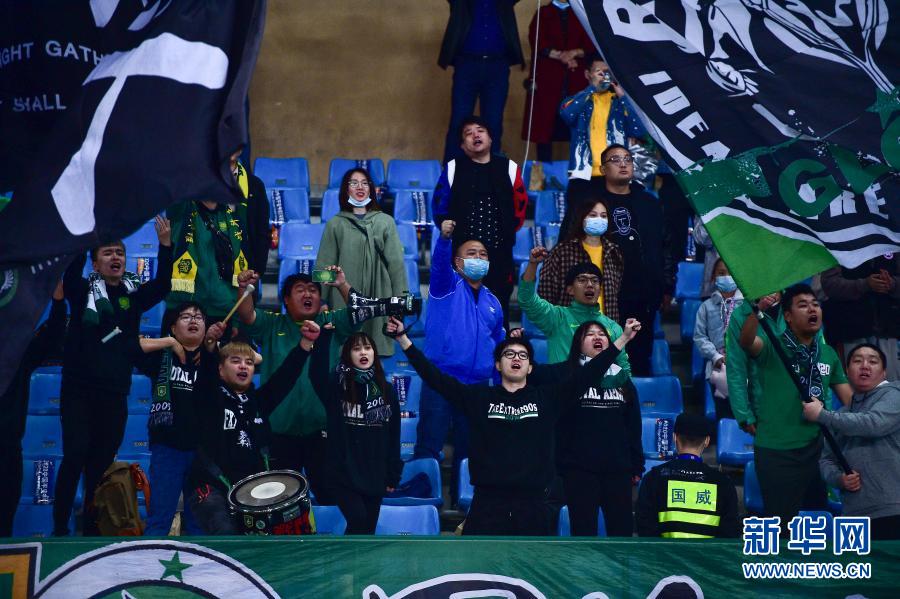 11月11日,北京中赫国安队球迷赛后庆祝胜利。当日,在2020赛季中国足球协会超级联赛(苏州赛区)争冠组第三、四名排位赛次回合比赛中,北京中赫国安队以1比1战平上海上港队,从而以两回合总比分3比2战胜上海上港队,获得本赛季联赛季军,上海上港队获得第四名。新华社记者 许畅 摄