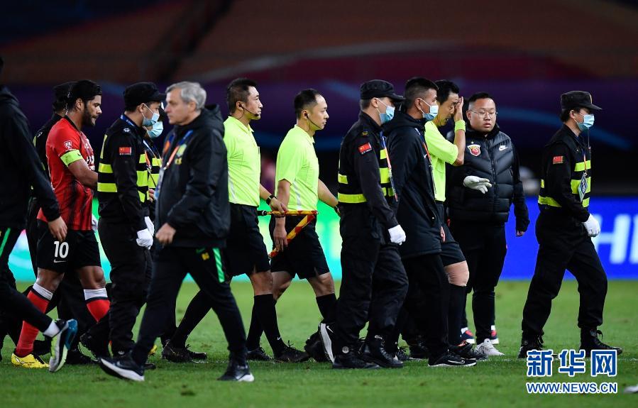 11月11日,裁判组在比赛后离场。当日,在2020赛季中国足球协会超级联赛(苏州赛区)争冠组第三、四名排位赛次回合比赛中,北京中赫国安队以1比1战平上海上港队,从而以两回合总比分3比2战胜上海上港队,获得本赛季联赛季军,上海上港队获得第四名。新华社记者 许畅 摄