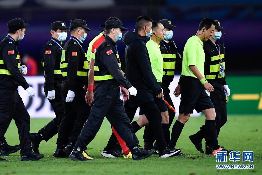 11月11日,裁判组在比赛后离场。当日,在2020赛季中国足球协会超级联赛(苏州赛区)争冠组第三、四名排位赛次回合比赛中,北京中赫国安队以1比1战平上海上港队,从而以两回合总比分3比2战胜上海上港队,获得本赛季联赛季军,上海上港队获得第四名。新华社记者 许畅 摄
