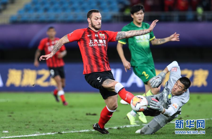 11月11日,上海上港队球员阿瑙托维奇(左)在比赛中射门。当日,在2020赛季中国足球协会超级联赛(苏州赛区)争冠组第三、四名排位赛次回合比赛中,北京中赫国安队以1比1战平上海上港队,从而以两回合总比分3比2战胜上海上港队,获得本赛季联赛季军,上海上港队获得第四名。新华社记者 杨磊 摄