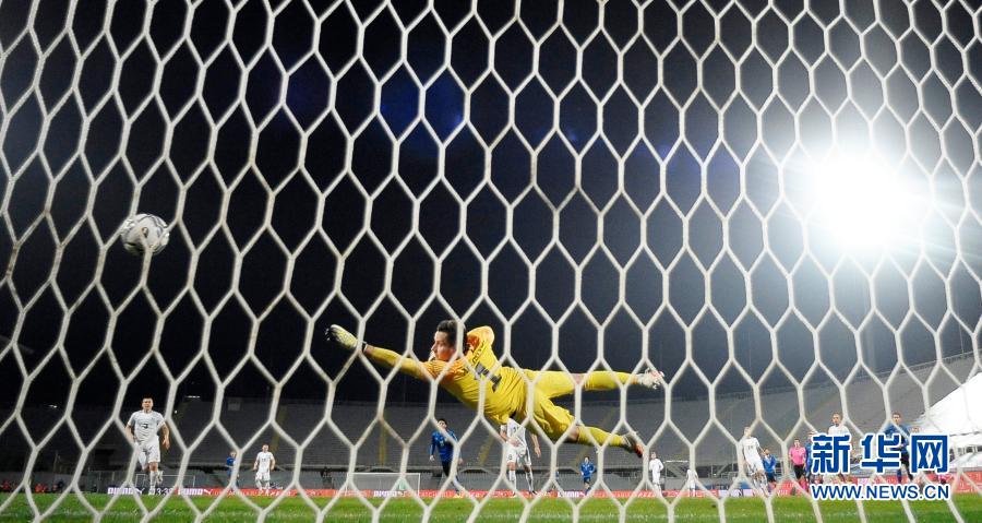 11月11日,爱沙尼亚队门将米里特斯未能扑出意大利队球员格里福的射门。