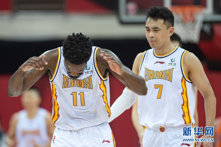 11月12日,山西汾酒股份队球员原帅(右)在比赛中安慰出现进攻失误的队友富兰克林。当日,在浙江诸暨举行的2020-2021赛季中国男子篮球职业联赛(CBA)第一阶段第12轮比赛中,山西汾酒股份队以121比118战胜上海久事队。新华社发(江汉摄)