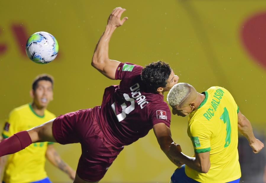 11月13日,巴西队球员里沙利松(右)在比赛中头球攻门。