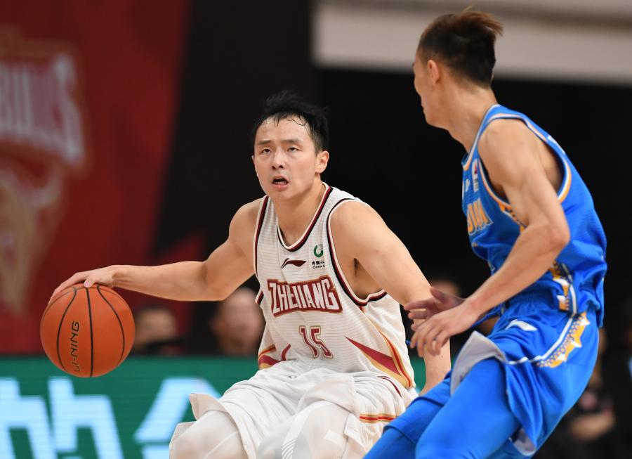 11月14日,浙江稠州金租队球员王奕博(左)在比赛中控球。