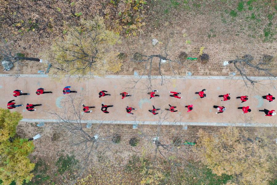 11月14日,徒步爱好者在邢台市七里河风景健身绿道内徒步(无人机拍摄)。