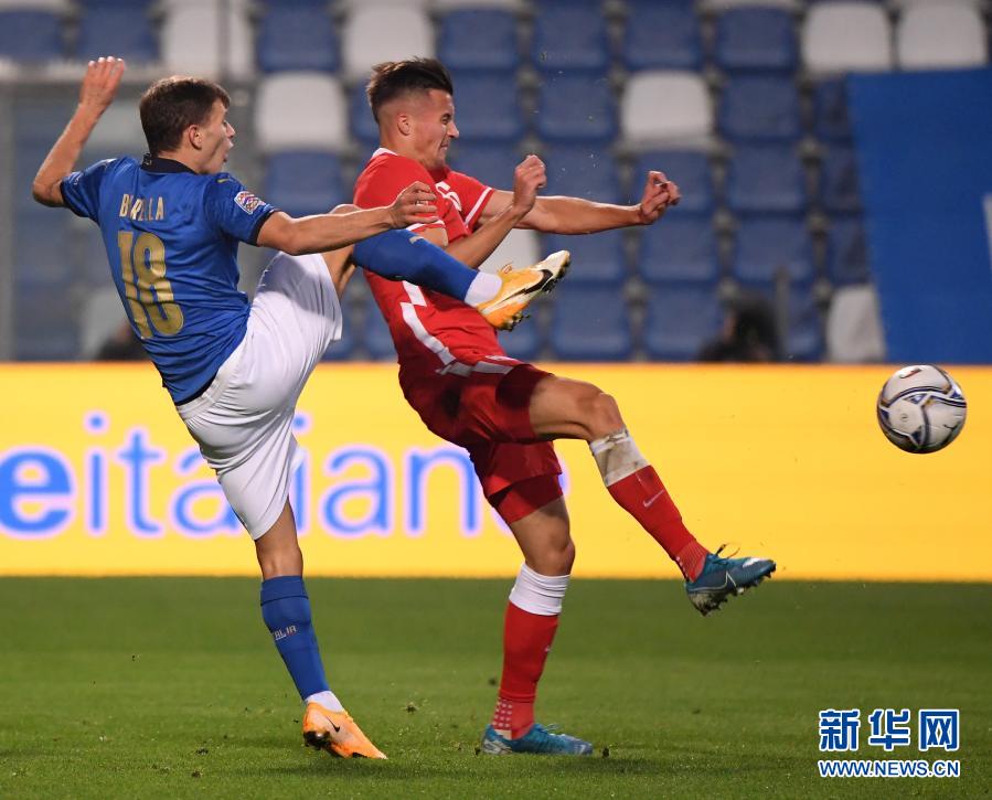 11月15日,意大利队球员巴雷拉(左)在比赛中和波兰队球员雷察拼抢。当日,在意大利雷焦艾米利亚进行的欧足联国家联赛A级第一组第五轮比赛中,意大利队主场以2比0战胜波兰队。新华社发(达尼埃莱·马斯科洛摄)