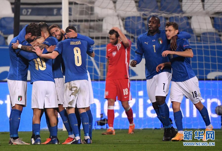 11月15日,意大利队球员在比赛中庆祝贝拉尔迪的进球。当日,在意大利雷焦艾米利亚进行的欧足联国家联赛A级第一组第五轮比赛中,意大利队主场以2比0战胜波兰队。新华社发(达尼埃莱·马斯科洛摄)