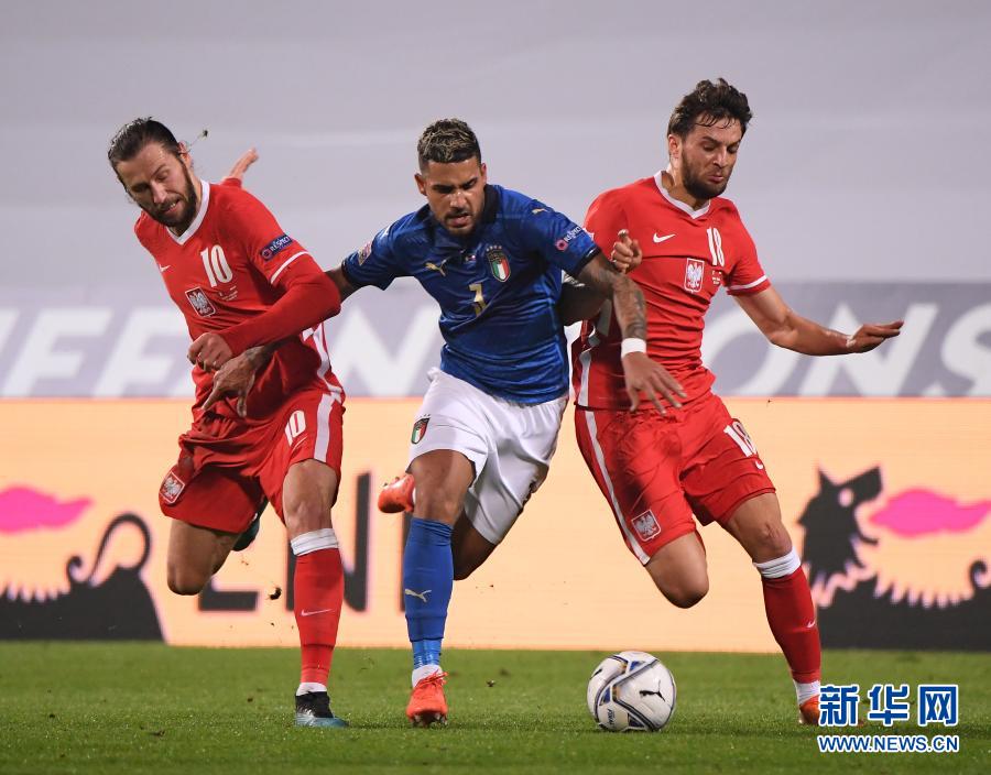 11月15日,意大利队球员埃莫森(中)在比赛中和波兰队球员克里霍维亚克(左)、贝雷辛斯基拼抢。当日,在意大利雷焦艾米利亚进行的欧足联国家联赛A级第一组第五轮比赛中,意大利队主场以2比0战胜波兰队。新华社发(达尼埃莱·马斯科洛摄)