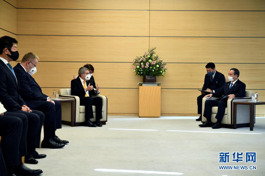 当日,国际奥委会主席巴赫与日本首相菅义伟在东京举行会谈,双方一致确认,明年东京奥运会将如期举行。新华社/路透