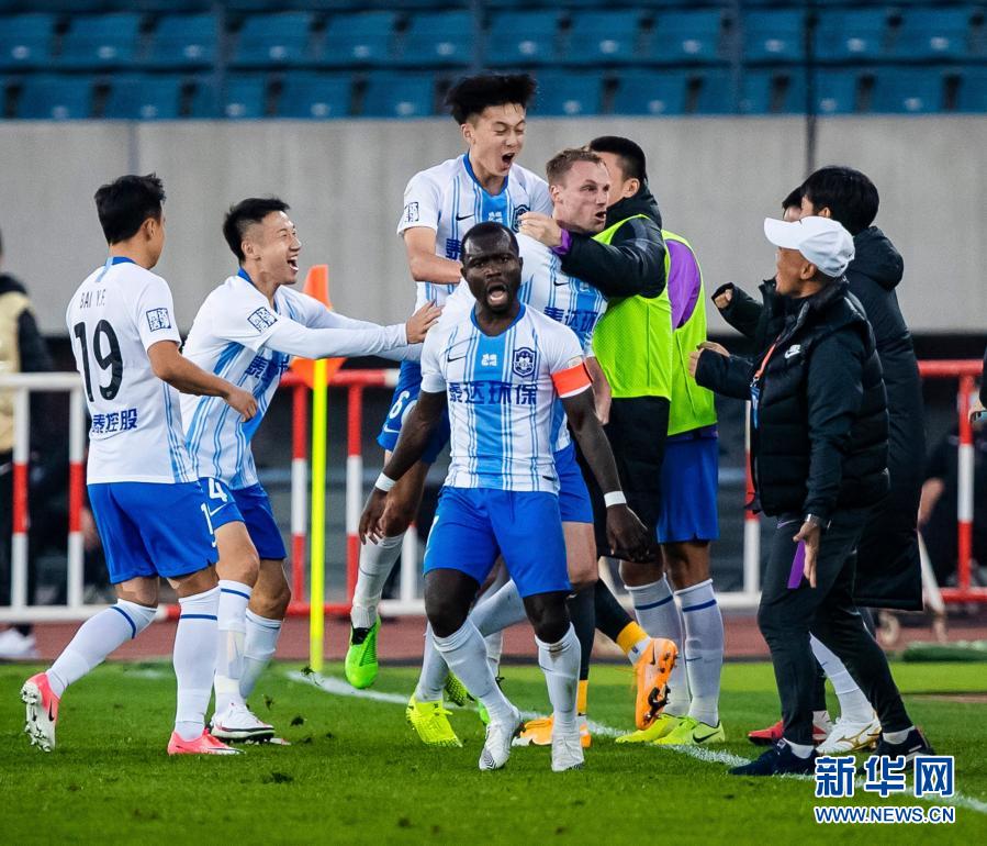 图为10月21日,天津泰达队球员、教练员赛后庆祝保级成功。新华社发(黎江文摄)