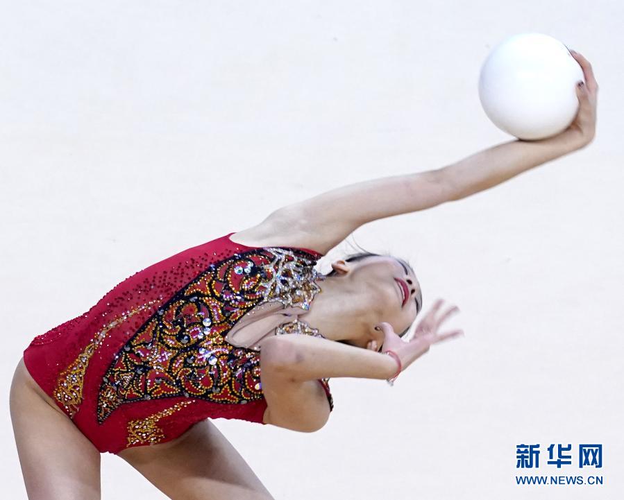 11月16日,陕西队选手王子露在球操比赛中。当日,在重庆举行的2020年全国艺术体操冠军赛成年个人球操比赛中,四川队选手赵樾以22.40分的成绩夺得冠军,陕西队选手王子露和山西队选手赵雅婷分别以21.65分和20.85分的成绩获得亚、季军。新华社记者 陈建力 摄