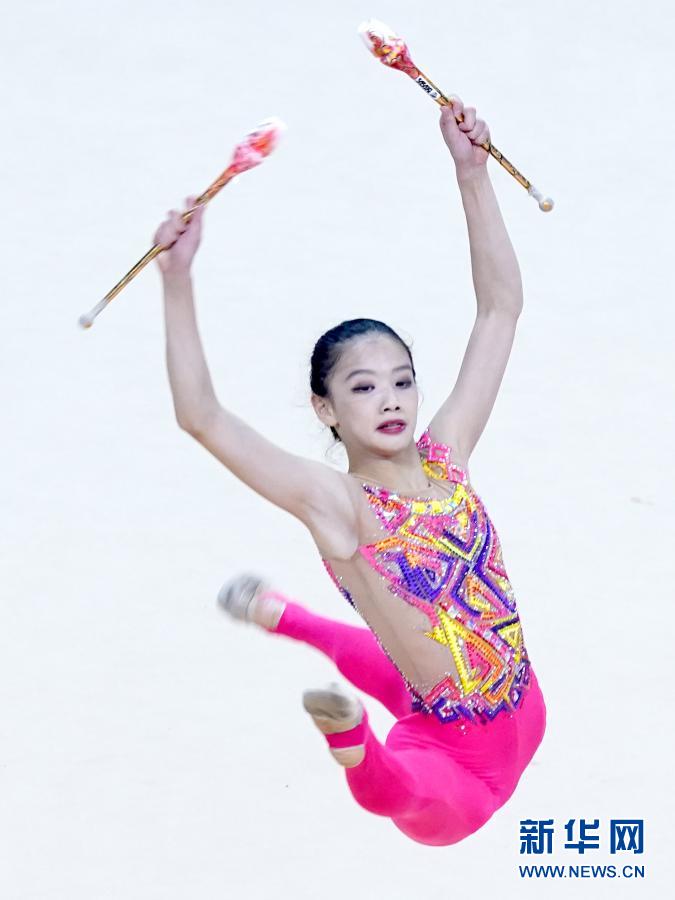 11月16日,浙江队选手王澜静在棒操比赛中。当日,在重庆举行的2020年全国艺术体操冠军赛成年个人棒操比赛中,山西队选手赵雅婷以21.50分的成绩夺得冠军,重庆队选手杨瑞婷和浙江队选手王澜静分别以20.75分和20.70分的成绩获得亚、季军。新华社记者 陈建力 摄