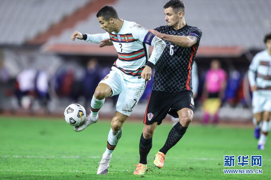 11月17日,葡萄牙队球员克·罗纳尔多(左)在比赛中和克罗地亚队球员洛夫伦拼抢。当日,在克罗地亚斯普利特进行的欧足联国家联赛A级第三组第六轮比赛中,葡萄牙队客场以3比2战胜克罗地亚队。新华社发(斯拉夫科·米卓尔摄)