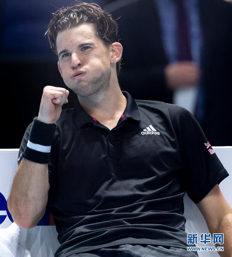 11月17日,蒂姆在获胜后庆祝。当日,在英国伦敦进行的2020ATP世界巡回赛年终总决赛小组赛单打比赛中,奥地利选手蒂姆以2比0西班牙选手纳达尔。新华社记者韩岩摄