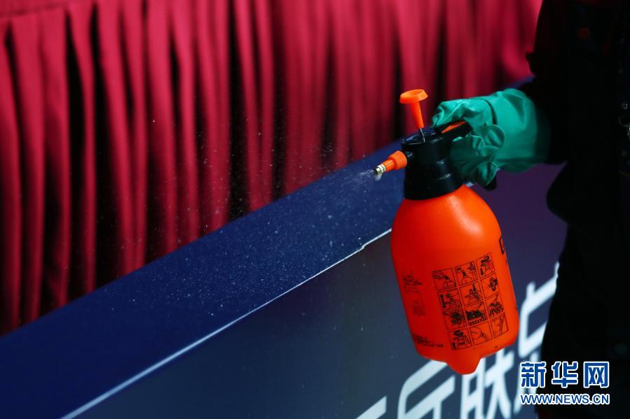 这是11月20日,工作人员在比赛场地喷洒消毒液。