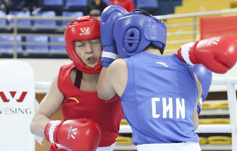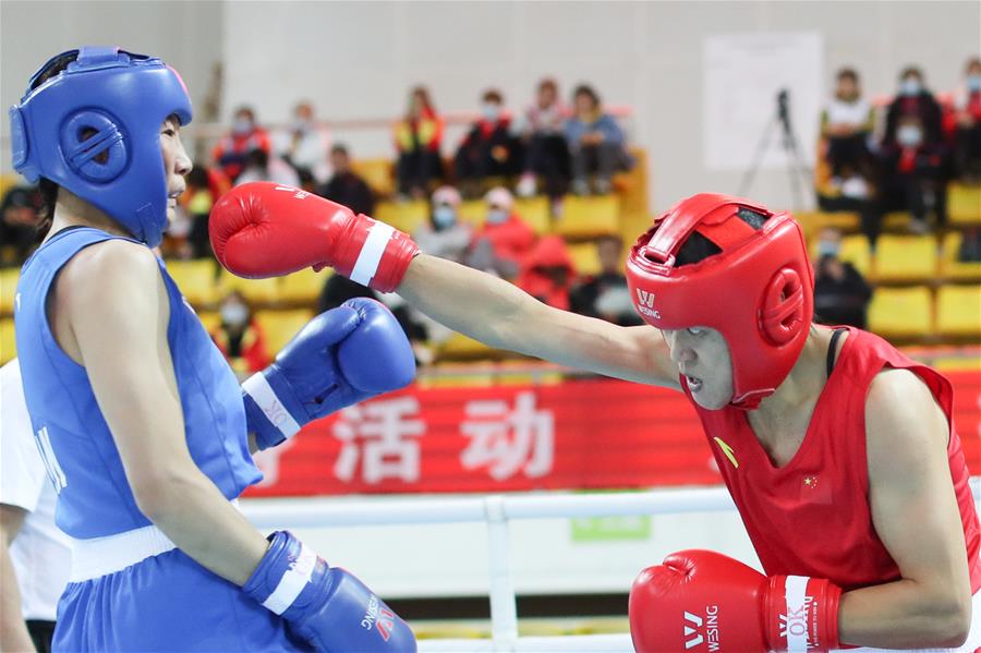 10月22日,陕西队选手谷红(右)与内蒙古队选手杨柳在69公斤级决赛中。 当日,在河北省迁安市唐山九江体育中心进行的2020年“迁安杯”全国女子拳击锦标赛69公斤级决赛中,陕西队选手谷红以4比1战胜内蒙古队选手杨柳,获得冠军。