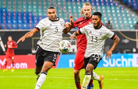 11月11日,德国队球员阿米里(中)与捷克队球员巴拉克(右)拼抢。在德国莱比锡举行的一场足球友谊赛中。