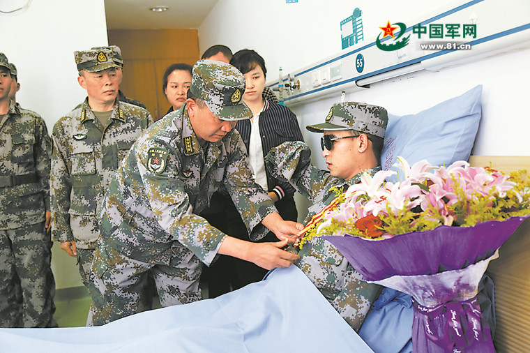 11月24日,南部战区陆军云南扫雷大队在病房内为杜富国举行颁授一等功奖章和证书仪式。周贤军摄
