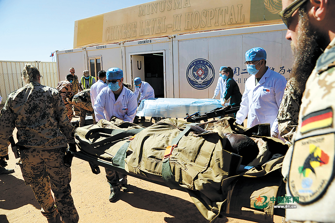 中国第6批赴马里维和医疗分队官兵和友军共同转运伤员。阿勒木斯摄